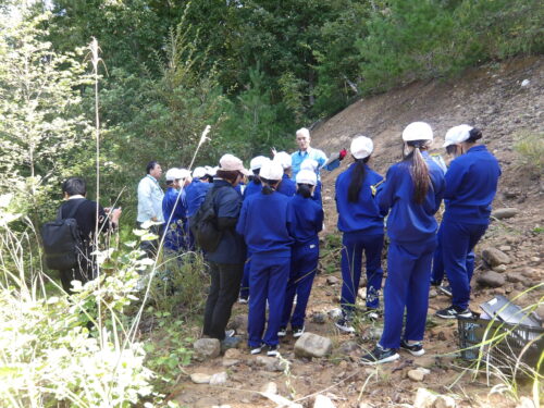学校内ではなく、地層が見える山の中で授業を行いました。