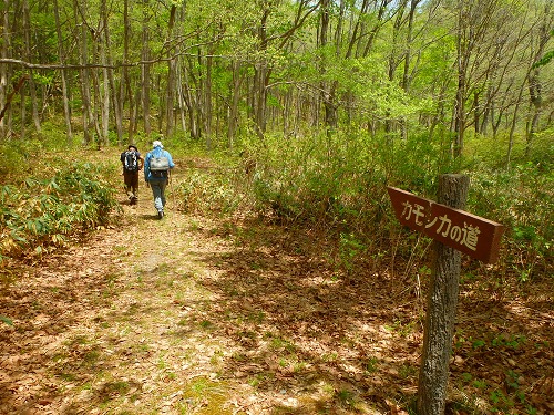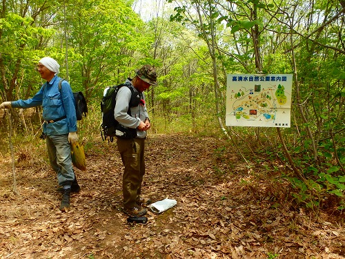 高清水公園の案内図[/column] [/row] [row] [column size=”2/3″ center=”no”] 目的が山菜採りではないことから町への連絡を省略して、教わったカモシカの道を約1時間弱上り鳥居峠へ分かれる付近に到着した。地図上ではこの付近から峠に出ることになるが、案内は全くない。そのため、渡部氏がルート探しの探索隊として探しに出る。