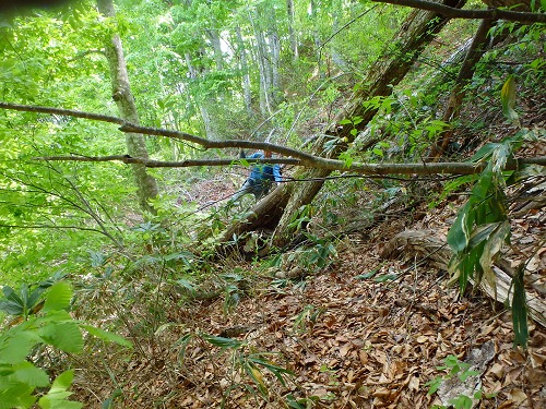 今回の踏査は、鳥居峠ルート踏査がもう一つの目的であり、ルート確認の意味を含めて予定通り昭和村の玉川中流部への下山を開始した。しかし峠道らしき道がところどころ斜面崩壊や草木が繁茂してかき消されており、前に進む事が困難となり何回か渡部氏が先道を探しに出ることとなった。