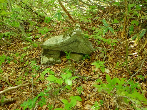 [row] [column size=”2/3″ center=”no”] 峠から約1km近くを悪戦苦闘しながら進むと祠を発見、見ると半ば崩れかかっており、屋根部がわずかにその面影を残している。おそらくここが、カワト沼を経由して玉川下流部へ出るルートと我々が向かう玉川中流部へ出る分岐点と想定される。
