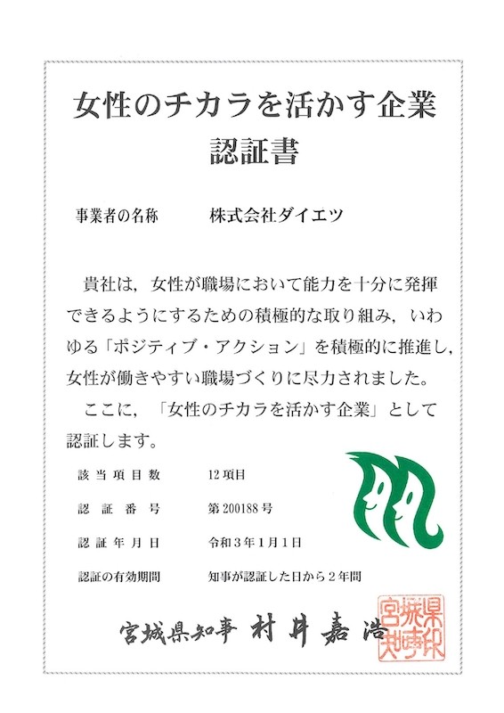 宮城県「女性のチカラを活かす企業」認証